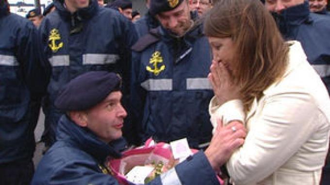 Maar er viel ook leuk nieuws te rapen. Zo was er een bemanninglid die zijn vrouw een huwelijksaanzoek deed (zie foto). Het fregat F931 Louise-Marie gaat nu voor enkele maanden in onderhoud. De bemanning die naar de Afrikaanse oostkust trok, krijgt drie weken vakantie. “Het is voor hen een welverdiende rust”, besluit commandant Gillis.
