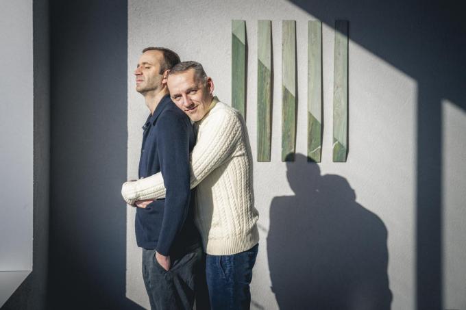 We treffen Xavier en Bas op een zeldzaam vrij moment samen in de Oever Gallery in hun thuisstad Oostende, waar Bas een expo heeft lopen met minimalistische kunst. Eenvoudig en sober en tegelijk verrassend kleurrijk en complex, een dualiteit die je ook in de heren zelf en hun relatie vindt. Er schuilt een vanzelfsprekendheid in hoe ze met elkaar omgaan, al vinden hun handen elkaar vaak tijdens het gesprek. Liefdevolle knijpjes en dito pretoogjes verraden dat ze elkaar na 15 jaar nog altijd begrijpen zonder woorden.