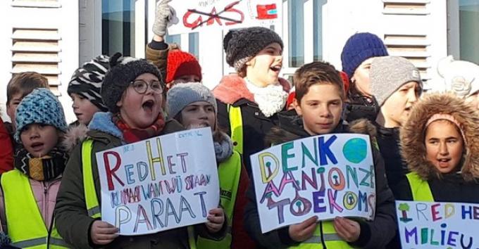 De mars werd ontvangen door schepen van sociale zaken en welzijn, Willy Hosten en milieuambtenaar Marlies Clarisse. De kinderen van de verschillende scholen deden enkele klimaatdansjes en scandeerden slogans zoals ‘Mos mos mos, wij willen bos’ en ‘Wij slaan alarm, het klimaat wordt te warm’.
