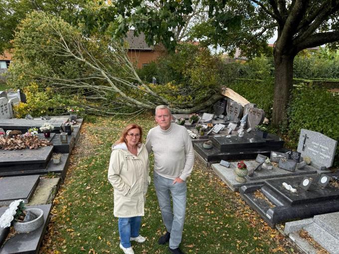 Een stuk stam en grote tak waaiden op twee rijen graven van de begraafplaats in centrum Ieper. Onder meer de familiegraven van Chris (71) en Rosette (74) zijn beschadigd. “Dit doet pijn.”
