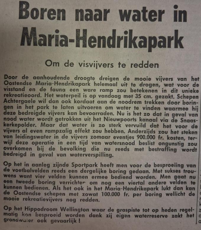 In Oostende werd dan weer in het Maria-Hendrikapark naar water geboord om te voorkomen dat de visvijvers volledig zouden uitdrogen. Midden juli was het waterpeil tot 35 centimeter gezakt.
