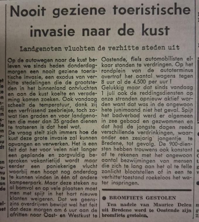Diezelfde kust werd tijdens de zomer van 1976 overspoeld door toeristen uit het buitenland, lezen we. Nooit geziene toeristische invasie naar de kust: landgenoten vluchtten de verhitte steden uit, kopte De Zeewacht. Zelfs de term exodus werd uit de kast gehaald en op 1 juli om 8 uur ‘s ochtends zochten al liefst 4.500 automobilisten een parkeerplekje in Oostende.