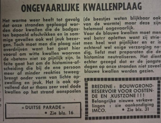 In die mate dat onze krant een stukje wijdde aan het feit dat de kwallen totaal ongevaarlijk waren. Het gaat hier vooral om witte kwallen waarvan de beten niet zo pijnlijk zijn, lezen we. Enkel wat lichte opzwelling en jeuk. Het is ook opvallend dat er thans zeer veel dode kwallen om het strand aanspoelen (de beestjes weten blijkbaar ook van de warmte) maar deze zijn helemaal ongevaarlijk. Voor de blauwe kwallen moet men beter opletten, want zijn striemen heel wat pijnlijker.