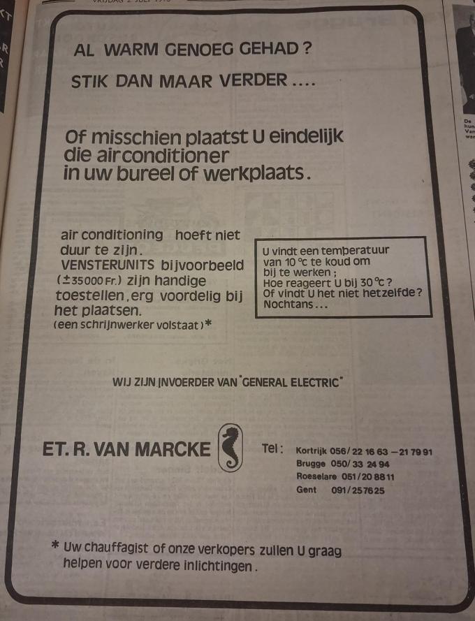 Ook de marketeers avant la lettre speelden handig in op de hitte en droogte. Dat bewijst deze advertentie van een West-Vlaams sanitairbedrijf. Al warm genoeg gehad? Stik dan maar verder… Of misschien plaatst u eindelijk die airconditioner in uw bureel of werkplaats. Duidelijker kan niet.