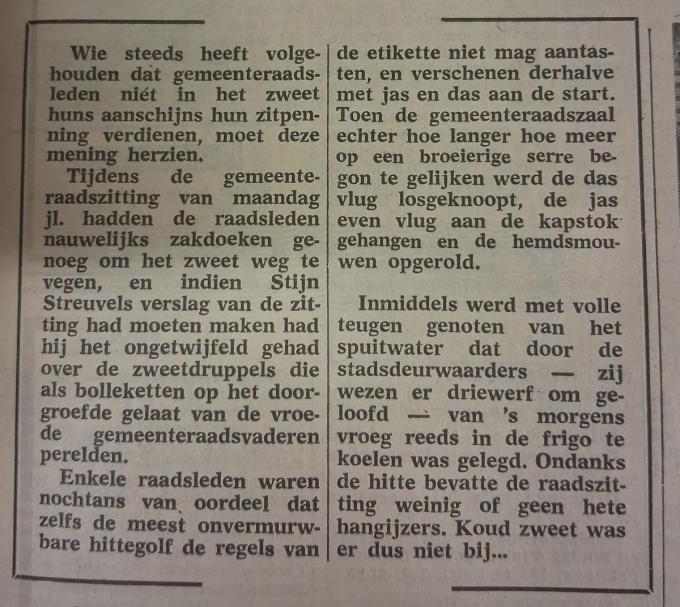 Lezen we verder nog: toen de raadszaal hoe langer hoe meer op een broeierige serre begon te gelijken, werd de das vlug losgeknoopt, de jas even vlug aan de kapstok gehangen en de hemdsmouwen opgerold.