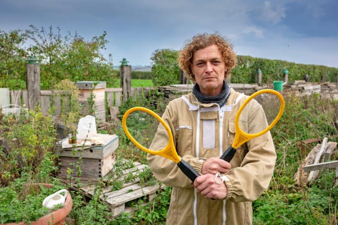 In zijn achtertuin in Poperinge staat Charly Derycke op post tussen vier bijenkasten. Gewapend met twee elektrische vliegenmeppers speurt hij naar Aziatische hoornaars. De voorbije 69 dagen wist de imker er al 1.057 te doden. “In 2021 ben ik gestart met een eerste bijenkolonie, maar het is pas deze zomer dat Aziatische hoornaars zo’n plaag zijn”, zucht hij.