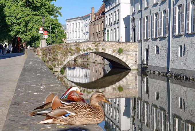 De mandarijneend geniet in Brugge van het gezelschap van andere eenden en verplaatst zich vooral via de kaaimuren van de reien. Enkele dagen geleden werd de eend door onverlaten weggejaagd, die het dier bekogelden met stenen. Deze week dook de eend toch weer op.