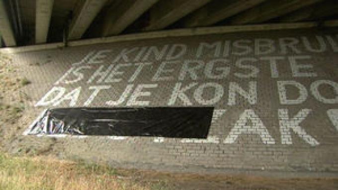 (UPDATE) Onbekenden hebben een opschrift geschilderd onder een brug over de E403 in Roeselare. De boodschap lijkt een aanklacht tegen iemand die kinderen zou hebben misbruikt. Op diezelfde plaats dook eerder al een gelijkaardige boodschap op. Het opschrift wordt morgenochtend verwijderd, voorlopig is een klein deel al afgedekt.