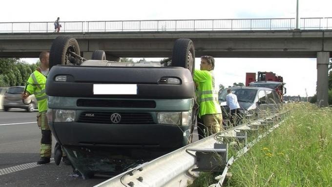 Een vrachtwagen, een volumewagen en een bestelwagen kwamen er onzacht met elkaar in contact. Dat laatste voertuig ging over de kop en kwam op zijn dak tegen de vangrail tot stilstand. De bestuurder werd met lichte verwondingen naar het ziekenhuis overgebracht.