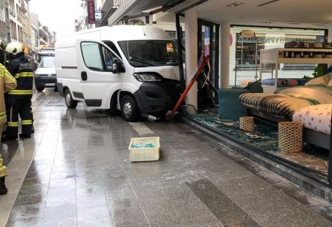 In de Kerkstraat in Blankenberge is even na de middag een bestelwagen van een pakjesdienst in de etalage van een slaapwinkel gereden.