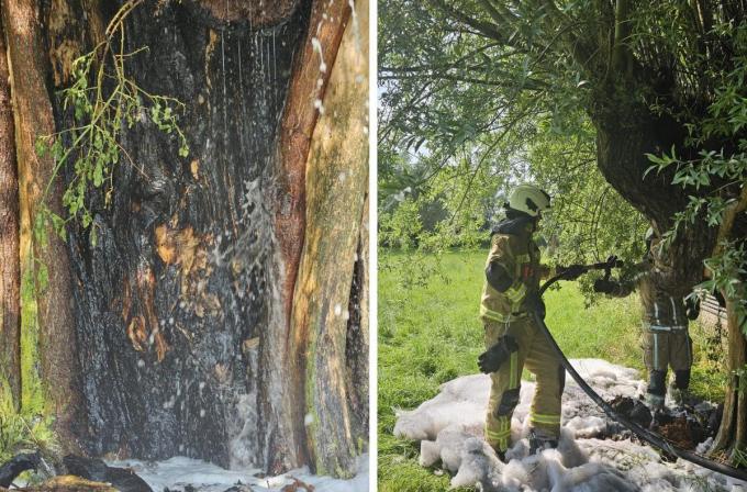 Daar bleek rond 17 uur een oude knotwilg in brand te staan. De brandweer rukte uit om de boom te blussen, maar die brandde toch nagenoeg volledig uit. Vanwege het zonnige en warme weer moest de brandweer nog enige tijd nablussen om heropflakkering te voorkomen.