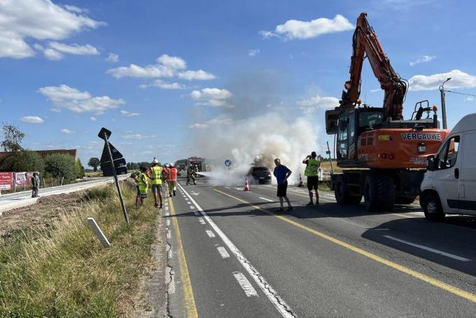 Het incident deed zich donderdagavond om 19.15 uur voor op het kruispunt van de Molendreef met de Ieperse Steenweg in Beauvoorde. Een 66-jarige vrouw uit Ieper reed er vanuit de Molendreef de Steenweg op tussen de wegenwerken toen ze merkte dat er iets fout was aan haar BMW. “De vrouw werd eerst een geur van rubber gewaar in het voertuig”, zegt korpschef Peter Billiouw van politiezone Spoorkin.