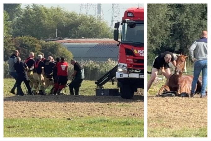 De brandweer en de dierenarts werden opgeroepen. Met verenigde krachten werd het dier op het droge getrokken, nadat eerdere pogingen om het met een hijsarm uit het water te halen afgeblazen werden omdat dat te gevaarlijk bleek voor de mensen en te stressvol voor het paard.