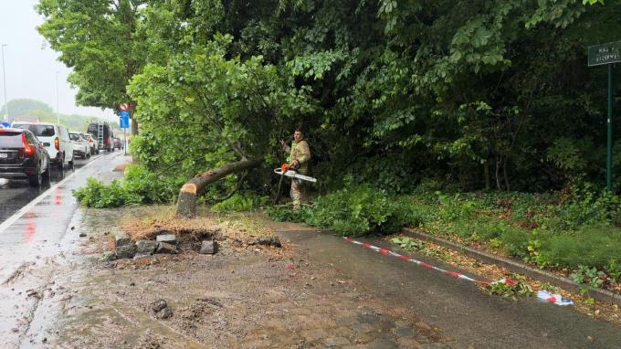 Daar was een boom, die eind vorige week in onduidelijke omstandigheden aangereden was, gevaarlijk aan het overhellen. Er werd dan ook uit veiligheidsoverwegingen besloten om de boom te rooien. Een klus die de brandweer in minder dan 15 minuten klaarde. Eens de boom verzaagd was, was het gevaarlijk voor fietsers en voetgangers geweken.