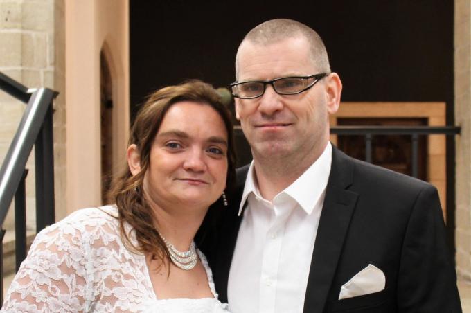 Stefanie Christiaens en haar echtgenoot Steven Merlevede op hun trouwdag in januari. © JVGK
