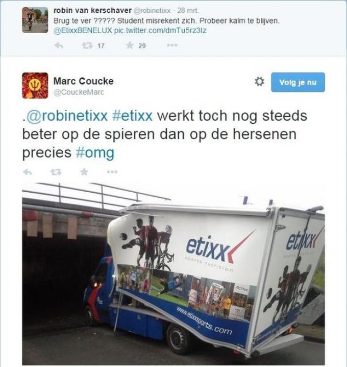 De brug in Wevelgem was maar 2,7 meter hoog en de vrachtwagen komt boven de 3 meter 10 uit. Toch probeerde jobstudent Sammy Laridon van sportmiddelenproducent Etixx eronder te rijden toen hij zaterdagochtend op weg was naar de start van Gent-Wevelgem voor wielertoeristen. “Een beetje verkeerd ingeschat”, klinkt het bij Sammy. Marc Coucke kon er wel om lachen en vroeg netjes toestemming voor hij de foto van het ‘lomp incident’ op Twitter zette.