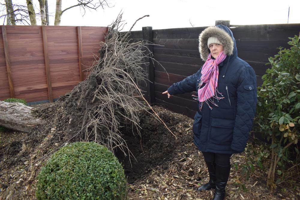 De boom is volledig ontworteld en heeft een groot gat in de tuin nagelaten. De boom is ook deels op de de poort gevallen. “Die is splinternieuw en kost 25.000 euro. Het geld gaat 20 maart van mijn rekening, en hij is al kapot.”