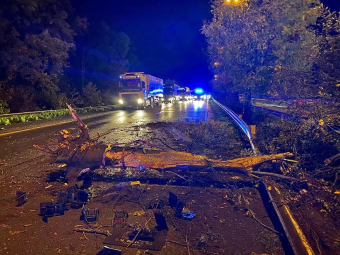 Door een nog onbekende reden week een Nederlandse vrachtwagen af van zijn rijvak en kwam in de middenberm terecht. Hij vernielde daarbij een 50-tal meter vangrail en ontwortelde daarbij een grote boom en wat struiken. De boom en de struiken kwamen zowel op de linkerrijstrook richting kust of richting E40 op de rijweg terecht. Beide rijstroken werden dan ook afgesloten. De brandweer zorgde voor signalisatie en maakte de rijweg vrij. De wegpolitie deed de vaststellingen. De bestuurder van de vrachtwagen was aangedaan door het ongeval, maar raakte niet gewond. In de richting van de E40 was er vertraagd verkeer.