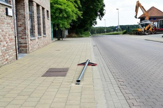 Het verkeersbord ligt helemaal richting Polderhoek, de breuk in de paal is recent. Wie iets gemerkt heeft, kan dat melden bij de lokale politie of bij het gemeentebestuur.