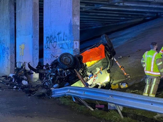 Aan de rechterkant van de rotonde kwam de auto tegen de verhakkelde vangrail terecht en belandde uiteindelijk ondersteboven tegen de pijler van de brug van de E17. De brandweer had een uur nodig om de bewusteloze bestuurder uit zijn wrak te bevrijden. Hij kreeg de eerste zorgen toegediend en werd daarna naar het ziekenhuis overgebracht.