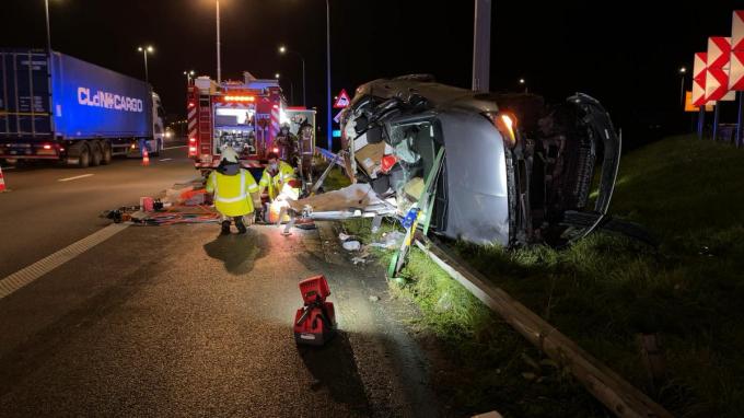 Die vangrail fungeerde als een soort van schans waardoor de wagen op zijn zij kwam te liggen. De bestuurder zat gekneld in zijn voertuig en werd door de brandweer bevrijd. Na een klein half uur kon de man overgebracht worden naar het ziekenhuis.