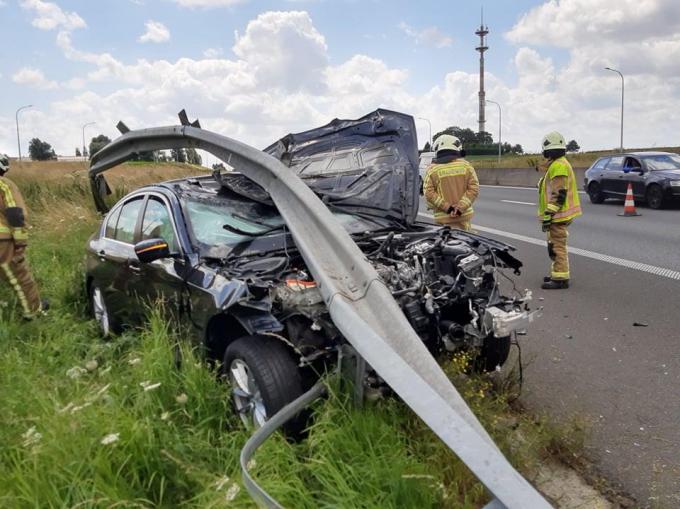 De vangrail kwam op het voertuig te liggen. De BMW geraakte zwaar beschadigd, de twee inzittenden kwamen wonder boven wonder met de schrik vrij.
