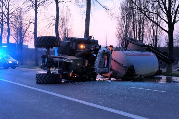 Het ongeval gebeurde toen de mestkar begon te slingeren en het gevaarte op de de flank belandde. (JT)