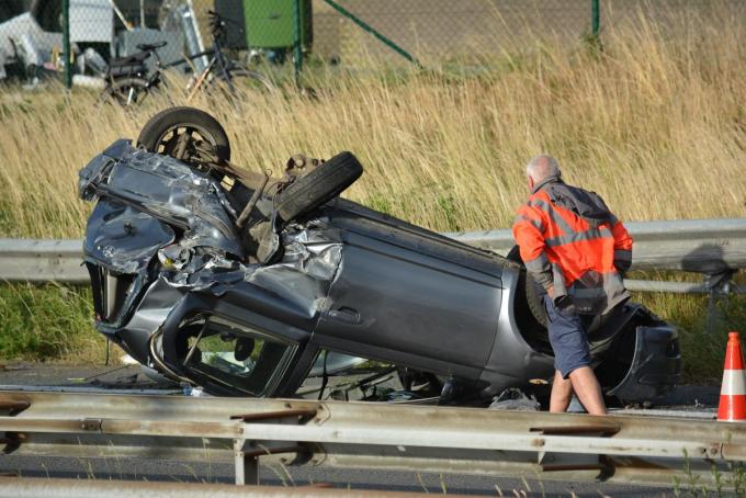 Op de E403 in Torhout zijn dinsdagavond twee auto’s zwaar met elkaar gebotst. Een Toyota ging daarbij over de kop en eindigde op het dak van de snelweg. Er viel als bij wonder slechts één lichtgewonde. De snelweg ging tweemaal kort even volledig dicht om brokstukken op te ruimen.