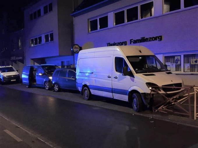 De man veroorzaakte eerst op het kruispunt van de Zuidstraat met de Patersstraat een aanrijding, maar reed daarna door. In de Leenstraat botste hij tegen een geparkeerde wagen links naast de weg. Die wagen schoof vooruit waardoor ook twee andere geparkeerde voertuigen schade opliepen. De bestuurder geraakte bij het ongeval lichtgewond en werd met een ambulance afgevoerd. Hij bleek onder invloed van medicatie te zijn.