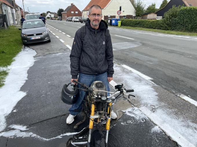 Jurgen Debosschere uit Roeselare baalt nadat hij net op tijd van zijn brandende motorfiets kon springen in Torhout. De tweewieler ging in vlammen op. © JH