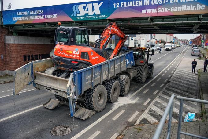Gebruikers van de Kortrijkse Meensesteenweg werden donderdagmorgen getrakteerd op een bizar tafereel. Een oplegger met graafmachine reed er tegen de spoorwegbrug ter hoogte van het voetbalstadion. De chauffeur werd gewond naar het ziekenhuis gebracht en het tafereel lokte heel wat kijklustigen.