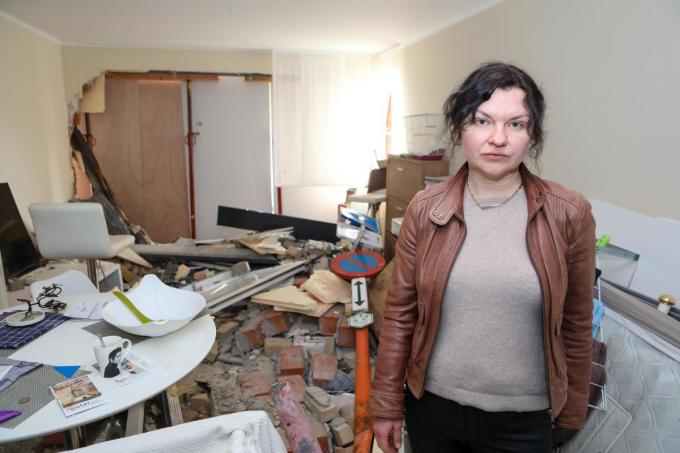 Alena woont samen met haar dochter in het appartement. Al is dat pas sinds drie weken. “Ik heb het gekocht en woon er sinds eind februari”, zegt ze. “Het was pas geschilderd en ik had er op maat gemaakte gordijnen gehangen. Maar nu is alles kapot. Gelukkig waren zowel ikzelf als mijn dochter niet thuis. Ik mag er niet aan denken dat hier iemand in de living zat. Of dat er net een voetganger passeerde. Mijn twee parkieten zijn wel weg. Hun kooi was kapot en ze zitten er niet meer in. Ofwel liggen ze ergens onder het puin, ofwel konden ze wegvliegen.”