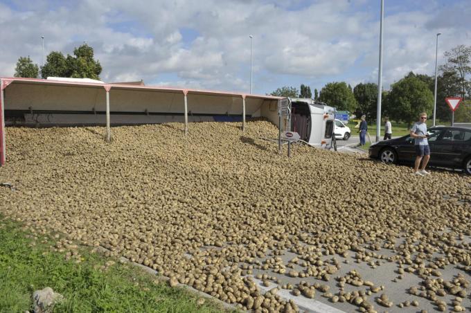 De vrachtwagen kantelde volledig. Een chauffeur uit Ledegem kwam vanuit richting centrum gereden en stond met zijn Peugeot-voertuig te wachten om de rotonde op te rijden. “Plots bemerkte ik dat die vrachtwagen kantelde. Ik probeerde mijn auto nog in achteruit te plaatsen, maar er stond een ander voertuig achter mij geparkeerd. Mijn auto staat nu tussen de aardappelen. Op ’t eerste zicht heb ik geen schade”, zegt de jongeman.