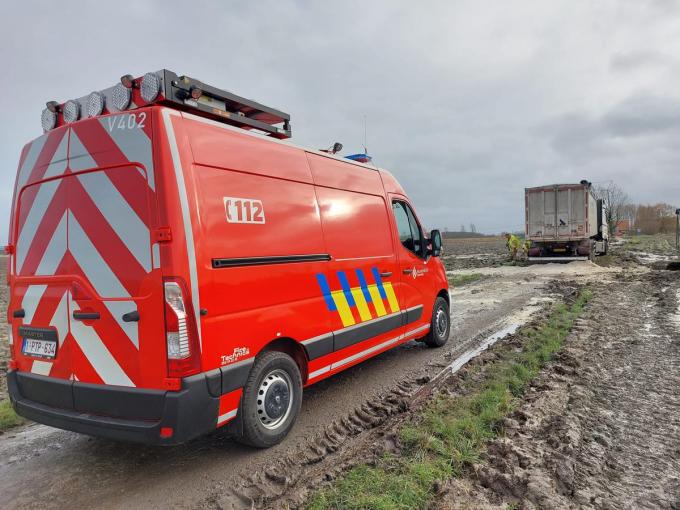 Takelaar Degrave uit Middelkerke was zaterdag de hele dag bezig om de moeilijk bereikbare vrachtwagen opnieuw op de baan te krijgen, met behulp van landbouwers uit de buurt.