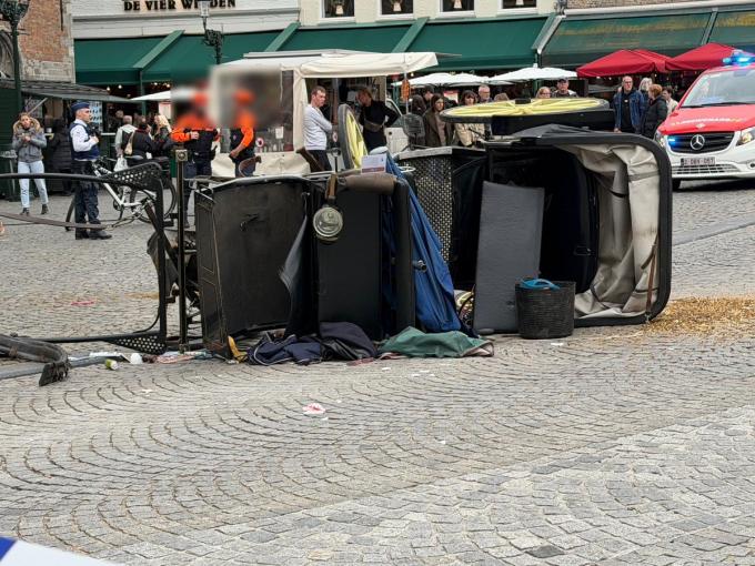 “Gelukkig waren er geen toeristen in de koets toen het paard op hol sloeg”, zegt Lien Depoorter van de politie Brugge. Aan het begin van de Wollestraat kantelde de koets, toen het rijtuig haperde tegen een paaltje op de hoek met de Markt. “De ervaren vrouwelijke koetsier viel op de grond, maar liep gelukkig geen breuken of andere verwondingen op”, vervolgt Dirk Stael.