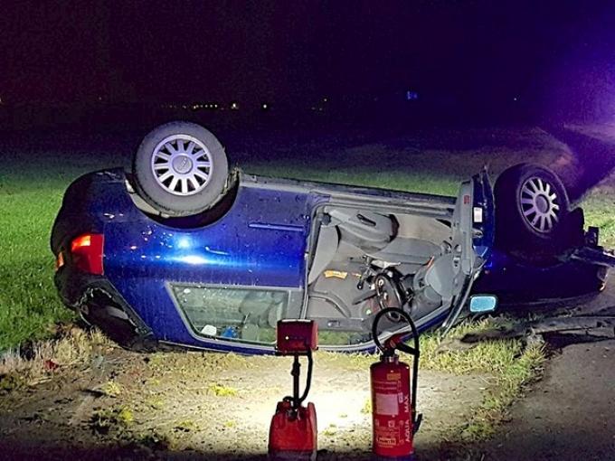 De jongeman schatte een bocht verkeerd in en verloor de controle over het stuur. De wagen begon te slippen en belandde aan de overkant van de straat op zijn dak in de gracht. De brandweer kwam ter plaatse, de lokale politie deed de nodige vaststellingen. Het voertuig moest getakeld worden.