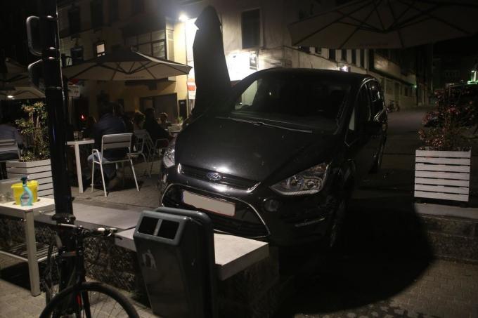 De wagen raakte bij het ongeval ernstig beschadigd en moest getakeld worden. “Het mag een wonder heten dat hier niemand gewond is geraakt”, reageerde een cafébezoeker die het allemaal zag gebeuren.