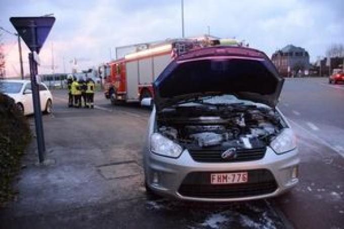 Bij hun aankomst stond de motorkap in volle rook. Achteraf bleek een kortsluiting in de motor van het voertuig de oorzaak van het onheil. Na enkele minuten was het vuur met poeder geblust, maar rijden was uitgesloten.