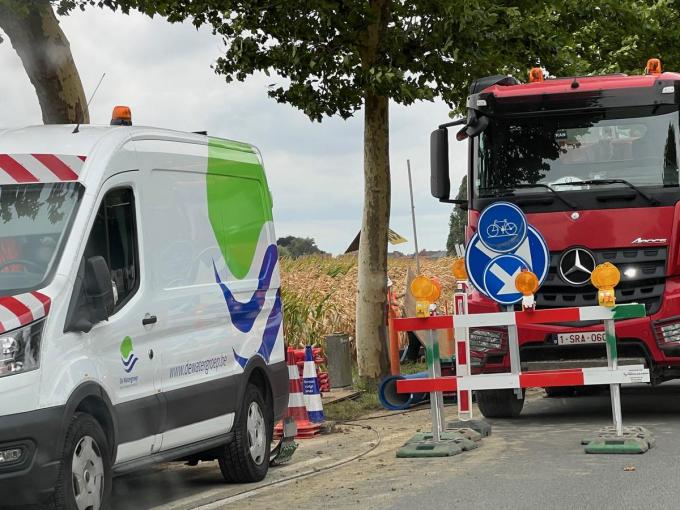Op de Rijksweg is De Watergroep al de hele dag bezig met de herstelwerken. Er is alternerend verkeer op die plaats. Door het lek waren uiteindelijk honderden gezinnen getroffen. (JH)