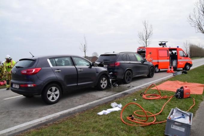 Brandweerpost Zonnebeke moest 1 vrouw bevrijden. Zes inzittenden werden gewond afgevoerd, waaronder drie kinderen.