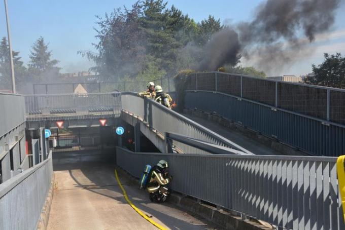 Het vuur ontstond langs de achterkant, waar de afsluiting met klimop is bekleed. Het vuur breidde zich razendsnel uit, waardoor twee geparkeerde wagens werden getroffen. Er ontstond ook een zware rookontwikkeling in de overdekte parking, waardoor de eigenaars hun auto niet konden bereiken.