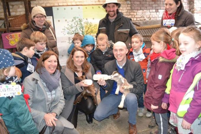 De voorzitter liet hielp even mee bij het geven van een flesje melk aan twee jonge geitjes. Ook de plaatselijke fractieleider voor Open VLD, Bert Schelfhout, kreeg die opdracht.
