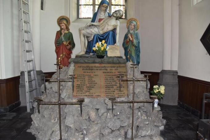 “Na de oorlog werd er een herdenkingsmonument geplaatst om de slachtoffers te herdenken. De kerktoren werd pas in 1923 hersteld. Sindsdien is de kerk van Kooigem een verdieping lager. In de kerk staat een piëta (beeld van een treurende moeder Maria met haar zoon Jezus) die symbool staat voor alle moeders die een zoon verloren in de oorlog. Die staat op stenen van de op 19 oktober 1918 vernielde kerktoren.”