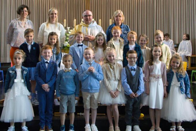 In de Maria-Bernardakerk in Zwevegem-Knokke mochten onlangs 16 kinderen hun eerste communie doen. Het waren Lavinia Coucke-Braillon, Mila Decoo, Léon Deldaele, Arthur Delrue, Yalina Grymonprez, Victor Labarque, Juliette Leconte, Chloé Mahieu, Remi Notebaert, Anaïs Poublon, Jason Poublon, Cyriel Pynket, Mario Steeland, Nore Tiebergyn, Lauden Vandevyvere en Leah Wolfvelde. (GJZ/foto ONA Digital)