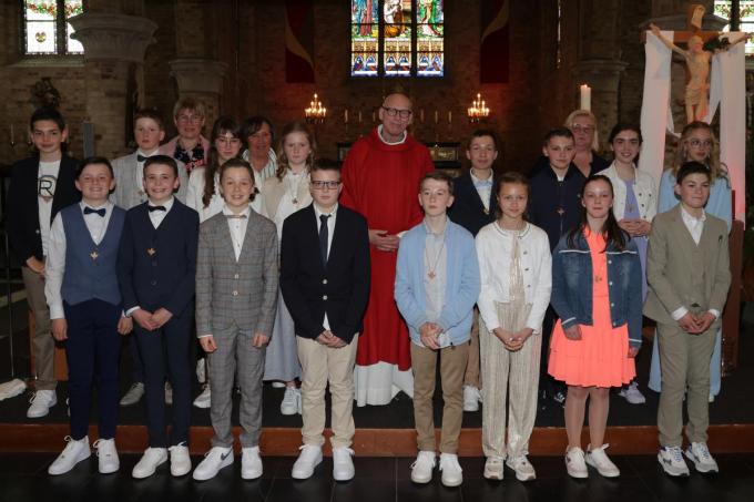 Bovenaan op de foto zien we Elias Bomme, Stan Rondelez, catechisten Ann Van Exem en Ingrid Couckuyt, Jana Hindryckx, Nel Casteleyn, vormheer Antoon Vandeputte, Kobe Cossey, Cedric De Cleer, catechiste Ann Weyts, Delphine Degrave en Renske Logghe. Onderaan staan Ruben Matthieu, Edward Ossaer, Henri Descamps, Arne Reynaert, Oscar Mispelon, Lize Desimpelaere, Marie Ameloot en Cyriel Bryon. (foto MG)