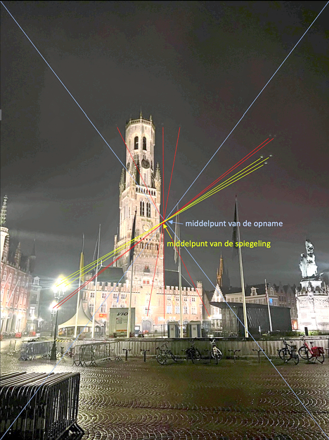 Maar toch noteert hij ook telkens de uitschieters. “Zo hadden we een speciaal geval in Brugge, waar een getuige een foto op 27 maart doorstuurde met daarop drie witte bollen, die veel groter leken dan een ster. Op de foto, rechts van het Belfort zien we drie lichten, die sterk aan de iconische driehoek van 1989-1991 doen denken. Wat we hier in werkelijkheid zien op de foto is niets anders dan een omgekeerd spiegelbeeld van de lampen op één van de straatarmaturen, die linksonder in beeld is. Bij dit type lensreflecties zit het middelpunt van de spiegeling altijd net naast het middelpunt van de opname”, legt Frederick zorgvuldig uit.