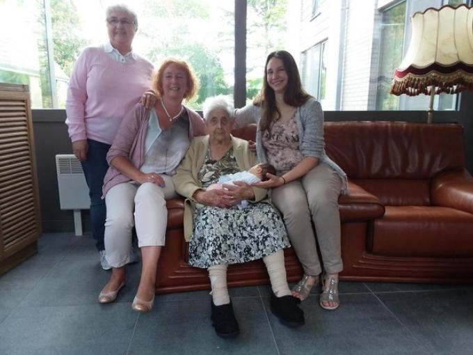 Op de foto zien we Adrienne samen met haar dochter Greta Vanderleen (70) uit Jabbeke, kleindochter Ann Sinnaeve (52) uit Jabbeke, achterkleindochter Bo Madoc (28) uit Kortrijk en de kleinste spruit Avalon Madoc Beernaert, die geboren werd op 3 mei.
