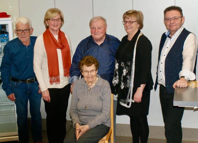 Dit jaar werden liefst zeven koorleden in de bloemetjes gezet: John De Backer (15 jaar op post), Marie-José Maes (25), Rosanna Verbeerst en echtgenoot Albert Vanderpiete (30), Zr.Irene (30), Katty De Rammelaere (40) en dirigent Rik Stevens (50). (gf)