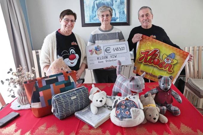 Anne heeft 41 jaar in het volwassenenonderwijs de vakken kleding en mode gegeven. Ze deed dat in de gemeenschapsschool aan de Manitobalaan in Sint-Andries Brugge. Sinds mei 2021 is ze met pensioen. Al enkele jaren maakt ze zich verdienstelijk door met zin voor precisie tassen en knuffels te naaien uit canvas of katoen en die tegen democratische bedragen aan de man te brengen. Ongeveer twee derde van de verkoopprijs schenkt ze aan Kloen. Zopas overhandigde ze 1.483 euro aan de vzw, een som waar Geert en Riet heel blij mee zijn.