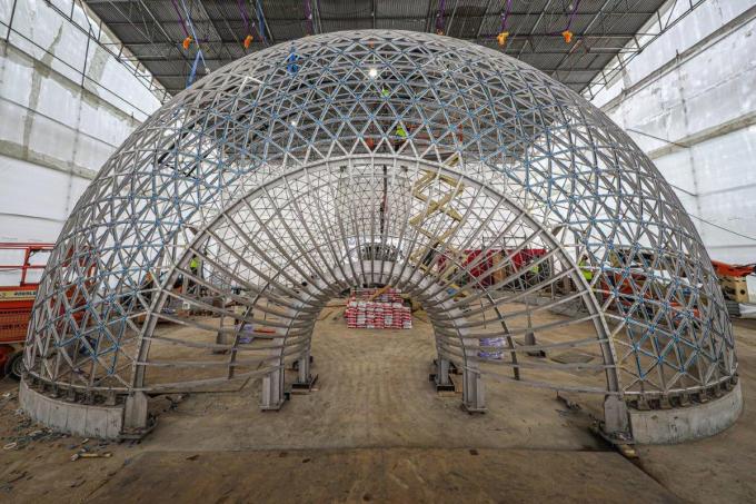 Julie De Pauw, development manager bij PSR: “De bouw van deze koepel doet denken aan het klassieke meccano-speelgoed, maar dan op topniveau. De vorm is eenvoudig, maar de structuur is complex. Elk element van de koepel is uniek en past perfect in de puzzel. Het afgewerkte geheel zal niet verraden welke technische hoogstandjes erin verborgen zitten.”